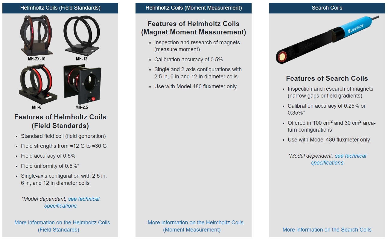 Standard field helmholtz coils, magnet moment measurement helmholtz coils, and search coils available.