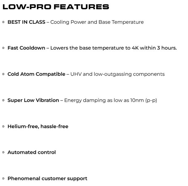 The Sidekick Low-Pro is the thinnest cryostat on the market at just 1.88″, delivering UHV performance, cold-atom compatibility, and industry-leading low vibration in a compact, accessible design.